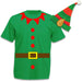 - Each set includes green t shirt with novelty elf design and soft felt striped elf hat.
